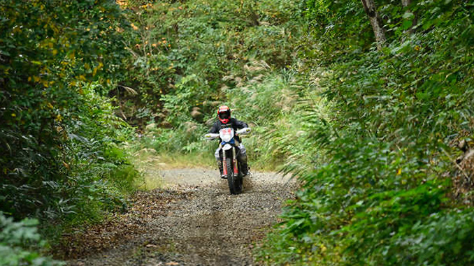 ラリーは山深く見事な杉の群生する峠を越えて岩手県へと向かう。この日は素晴らしい ダートエクスペリエンスデイだ。最初のダートは緩やかな川沿いを登っていくご褒美の ような道だ。折り重なる木々の間から見える空からは、森の妖精が下りてきそうだ。峠を 越えてこの日のSSに入る。1本目のSSは湖畔をぐるっとまわるツイスティなフラットダー トだ。無駄なく加減速を繰り返し、気持ちよくコーナーを楽しんでほしい。連続する2本目 のSSは登り基調だ。アクセル全開で駆け抜けてほしい。ダム湖を眺めながら盆地へと 下りていく。ルートは再度山地へと向かう。阿弥陀如来出現の地と言われる湖を通り、 ピークを越えて、紅葉が見事な峠へと向かう。峠では、看板の前にバイクを停めて、ぜひ 絶景を楽しんでほしい。ルートは滑りやすいフラットな路面を下り午前中とは反対側の 盆地へ出て、すぐに次の峠へと向かう。ここは、正岡子規が東北を旅した際に通り秋田 県から岩手県へ県境を越えたと伝わる峠だ。後半は草が多く少し苦労するかもしれな いが、子規の時代に比べたらなんという事はないだろう。紅葉のスポットとして賑わう 湖を抜けて、ビバークへと向かう。RESULTS